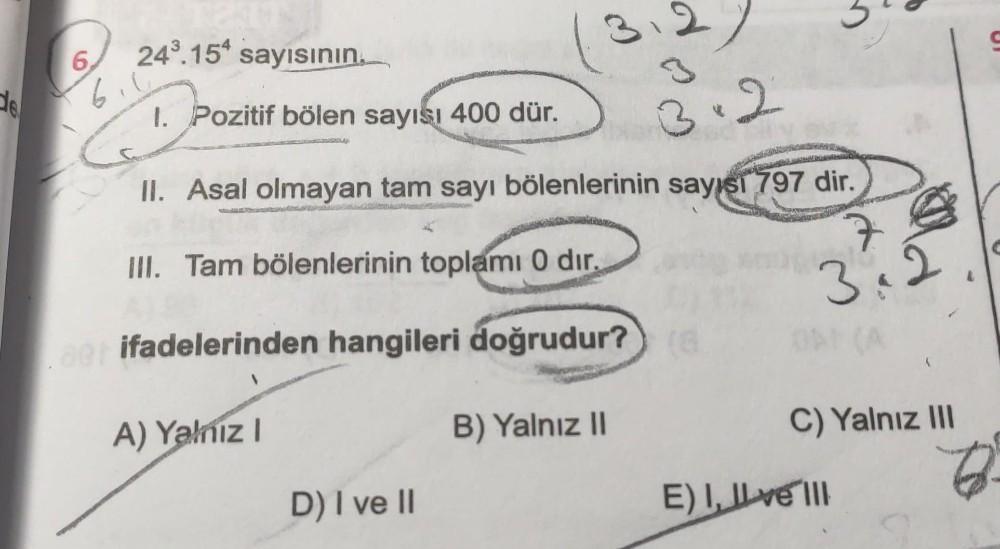 de 6, 24³.154 sayısının. 1. Pozitif bölen sayısı 400 dür. 3.2 II. Asal olmayan tam sayı bölenlerinin sayısı 797 dir. III. Tam bölenlerinin toplamı 0 dir. 7 aer ifadelerinden hangileri doğrudur? (8 3.2 B) Yalnız II A) Yalnız I 3 D) I ve II C) Yalnız III E) I, II ve III B S