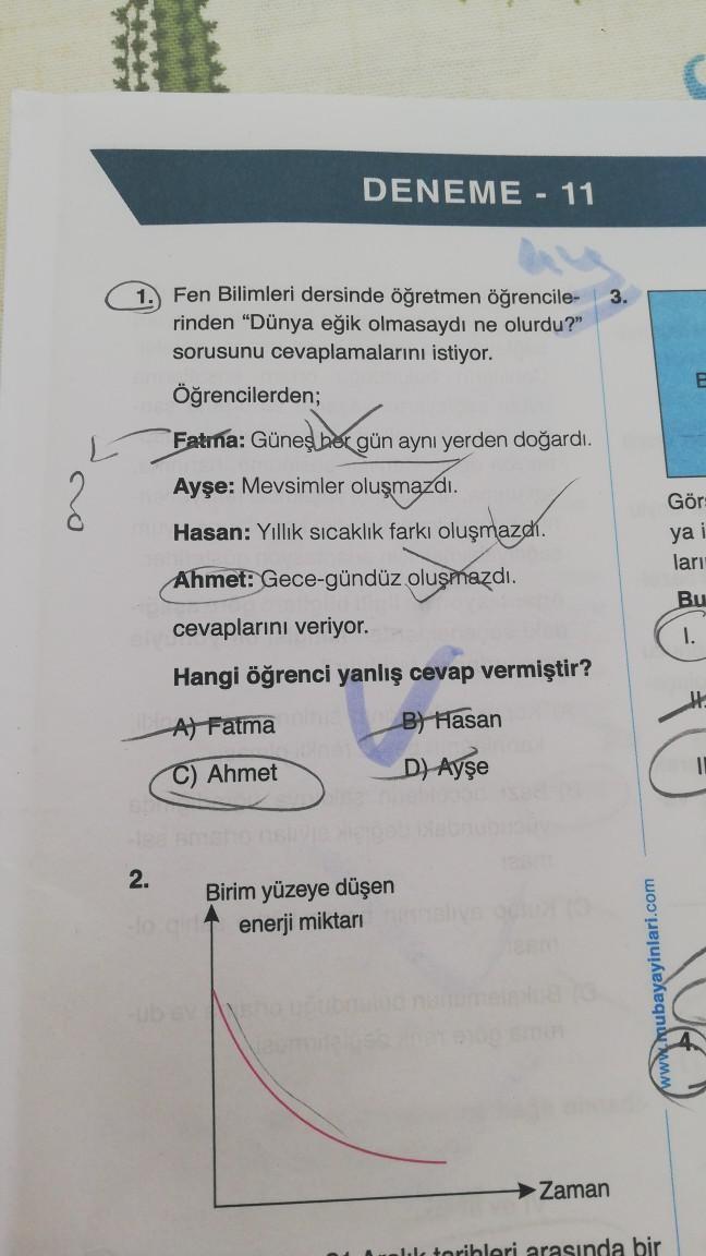 DENEME - 11 3. 1. Fen Bilimleri dersinde öğretmen öğrencile- rinden "Dünya eğik olmasaydı ne olurdu?" sorusunu cevaplamalarını istiyor. Öğrencilerden; Fatina: Güneş her gün aynı yerden doğardı. Ayşe: Mevsimler oluşmazdı. Hasan: Yıllık sıcaklık farkı oluşmazar. Gör ya ları Ahmet: Gece-gündüz oluşmazdı. Bu cevaplarını veriyor. 1. H. Hangi öğrenci yanlış cevap vermiştir? Al Fatma B) Hasan C) Ahmet D) Ayşe | 2. Birim yüzeye düşen enerji miktarı nubayayinlari Zaman Mulle tarihleri arasında bir