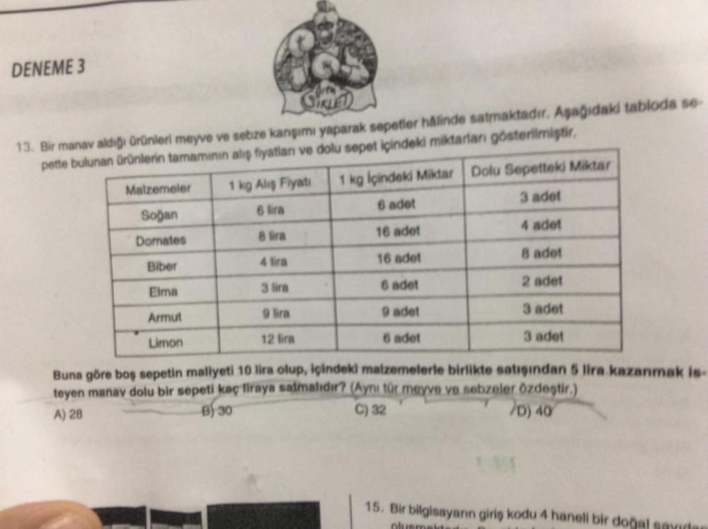 DENEME 3 SIKLED 13. Bir manav aldığı ürünleri meyve ve sebze kanşımı yaparak sepetler halinde satmaktadır. Aşağıdaki tabloda se- pette bulunan ürünlerin tamamının alış fiyatlan ve dolu sepet içindeki miktarları gösterilmiştir, Malzemeler Soğan Domates Biber Elma Armut Limon 1 kg Alış Fiyatı 1 kg İçindeki Miktar Dolu Sepetteki Miktar 3 adet 6 lira 6 adet 4 adet 16 adet 8 lira 8 adet 4 lira 16 adet 3 lira 6 adet 2 adet 9 lira 9 adet 3 adet 12 lira 6 adet 3 adet Buna göre boş sepetin maliyeti 10 lira olup, içindeki malzemelerle birlikte satışından 5 lira kazanmak is- teyen manav dolu bir sepeti kaç liraya satmalıdır? (Aynı tür meyve ve sebzeler özdeştir.) A) 28 B) 30 C) 32 D) 40 15. Bir bilgisayarın giriş kodu 4 haneli bir doğal sayıda plusmaids