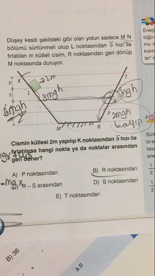 Düşey kesiti şekildeki gibi olan yolun sadece M N bölümü sürtünmeli olup L noktasından 9 hızı ile fırlatılan m kütleli cisim, R noktasından geri dönüp M noktasında duruyor. Cismin kütlesi 2m yapılıp K