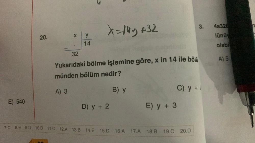 E) 540 20. X y 14 A) 3 3 X=145 +32 32 Yukarıdaki bölme işlemine göre, x in 14 ile bölü münden bölüm nedir? D) y + 2 B) y C) y + 1 E) y + 3 3. 7.C 8.E 9.D 10.D 11.C 12.A 13.B 14.E 15.D 16.A 17.A 18.B 19.C 20.D 4a32 lünüy olabi A) 5