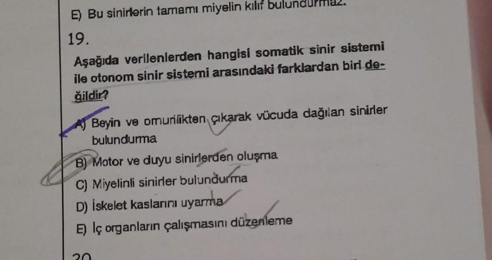 E) Bu sinirlerin tamamı miyelin kılıf bulun 19. Aşağıda verilenlerden hangisi somatik sinir sistemi ile otonom sinir sistemi arasındaki farklardan biri de- ğildir? Beyin ve omurilikten çıkarak vücuda dağılan sinirler bulundurma B) Motor ve duyu sinirlerden oluşma C) Miyelinli sinirler bulundurma D) İskelet kaslarını uyarma E) Iç organların çalışmasını düzenleme 20