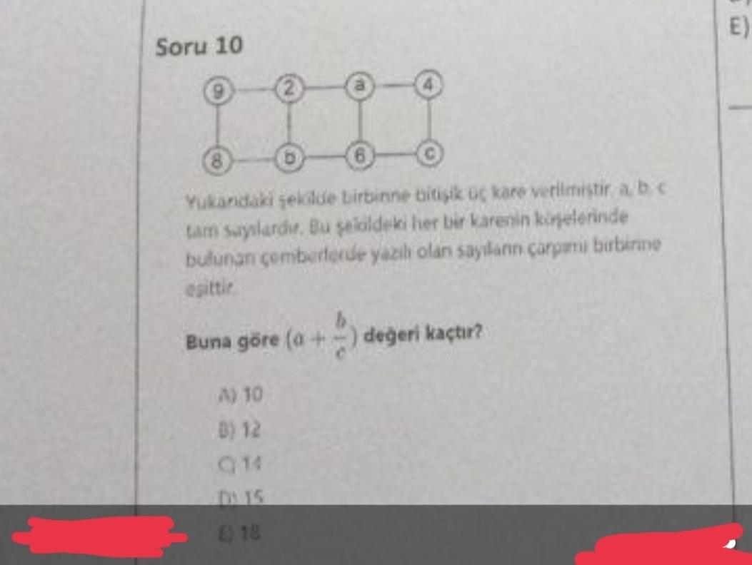 E) Soru 10 b Yukandaki şekilde birinne bitişik o kare verilmistir a b c tam soylardi. Bu seicildeki her bir karenin kielerinde b