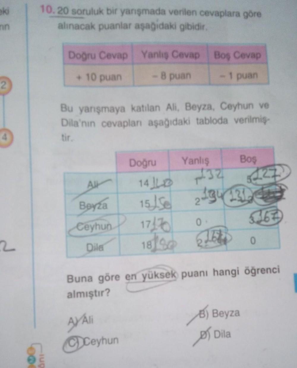 eki 2 2 10.20 soruluk bir yarışmada verilen cevaplara göre alınacak puanlar aşağıdaki gibidir. -lug Doğru Cevap + 10 puan All Beyza Ceyhun Dila Bu yarışmaya katılan Ali, Beyza, Ceyhun ve Dila'nın cevaplanı aşağıdaki tabloda verilmiş- tir. Yanlış Cevap 8 puan AVAli Ceyhun Doğru 14 L 15 Se 17170 1810 Yanlış Boş Cevap 1 puan 0. Bos 32 2134 136 41 Buna göre en yüksek puanı hangi öğrenci almıştır? 0 B)Beyza D Dila