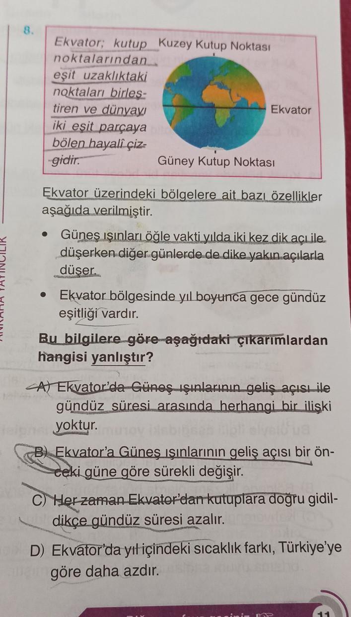 Ekvator; kutup Kuzey Kutup Noktası noktalarından eşit uzaklıktaki noktaları birles- tiren ve dünyayı iki eşit parçaya ● bölen hayalî çiz- gidir. Ekvator Güney Kutup Noktası Ekvator üzerindeki bölgelere ait bazı özellikler aşağıda verilmiştir. Güneş ışınları öğle vakti yılda iki kez dik açı ile. düşerken diğer günlerde de dike yakın açılarla düşer. Ekvator bölgesinde yıl boyunca gece gündüz eşitliği vardır. Bu bilgilere göre aşağıdaki çıkarımlardan hangisi yanlıştır? A) Ekvator'da Güneş ışınlarının geliş açısı ile gündüz süresi arasında herhangi bir ilişki yoktur. B) Ekvator'a Güneş ışınlarının geliş açısı bir ön- ceki güne göre sürekli değişir. C) Her zaman Ekvator'dan kutuplara doğru gidil- dikçe gündüz süresi azalır. D) Ekvator'da yıl içindeki sıcaklık farkı, Türkiye'ye göre daha azdır. cinin MP