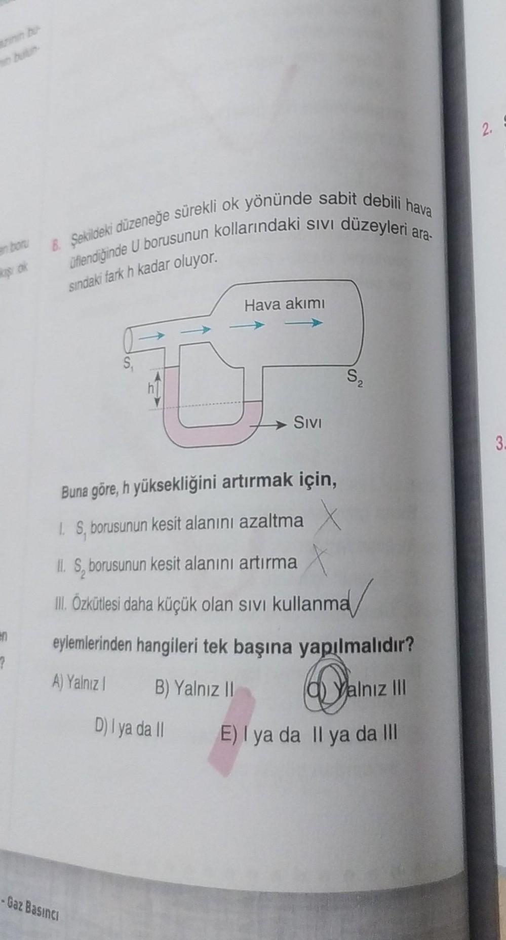 en 7 8. Şekildeki düzeneğe sürekli ok yönünde sabit debili hava üflendiğinde U borusunun kollarındaki sıvı düzeyleri ara- sındaki fark h kadar oluyor. S₁ -Gaz Basıncı Hava akımı SIVI Buna göre, h yüksekliğini artırmak için, 1. S, borusunun kesit alanını azaltma X II. S., borusunun kesit alanını artırma III. Özkütlesi daha küçük olan sıvı kullanma D) I ya da II S₂ eylemlerinden hangileri tek başına yapılmalıdır? A) Yalnız I B) Yalnız II a) Yalnız III E) I ya da Il ya da III 2.