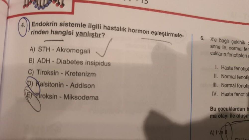 Endokrin sistemle ilgili hastalık hormon eşleştirmele- rinden hangisi yanlıştır? 6. X'e bağlı çekinik E anne ile, normal fer cukların fenotipleri A) STH - Akromegali B) ADH - Diabetes insipidus C) Tiroksin - Kretenizm b) Kalsitonin - Addison VEiroksin - Miksodema I. Hasta fenotipl II. Normal fenoti III. Normal fenoti IV. Hasta fenotip! Bu çocuklardan h ma olayı ile oluşm A) I vel