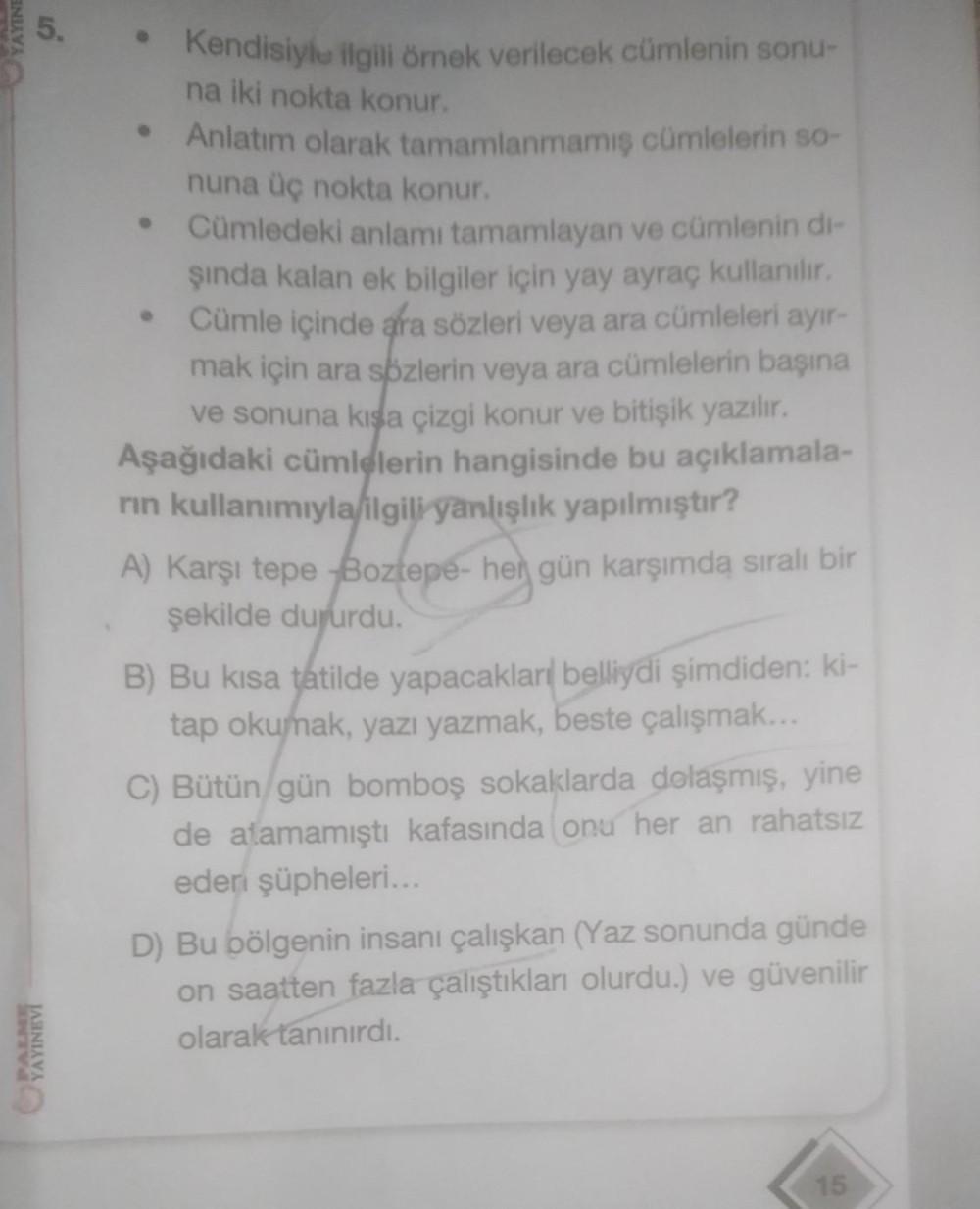 ENIAVA 5. YAYINEVI • Kendisiyle ilgili örnek verilecek cümlenin sonu- na iki nokta konur. Anlatım olarak tamamlanmamış cümlelerin so- nuna üç nokta konur. • Cümledeki anlamı tamamlayan ve cümlenin di- şında kalan ek bilgiler için yay ayraç kullanılır. Cümle içinde ara sözleri veya ara cümleleri ayır- mak için ara sözlerin veya ara cümlelerin başına ve sonuna kışa çizgi konur ve bitişik yazılır. Aşağıdaki cümlelerin hangisinde bu açıklamala- rin kullanımıyla ilgili yanlışlık yapılmıştır? ● A) Karşı tepe Boztepe- her gün karşımda sıralı bir şekilde dururdu. B) Bu kısa tatilde yapacaklar belliydi şimdiden: ki- tap okumak, yazı yazmak, beste çalışmak... C) Bütün/gün bomboş sokaklarda dolaşmış, yine de alamamıştı kafasında onu her an rahatsız eden şüpheleri... D) Bu bölgenin insanı çalışkan (Yaz sonunda günde on saatten fazla çalıştıkları olurdu.) ve güvenilir olarak tanınırdı. 15