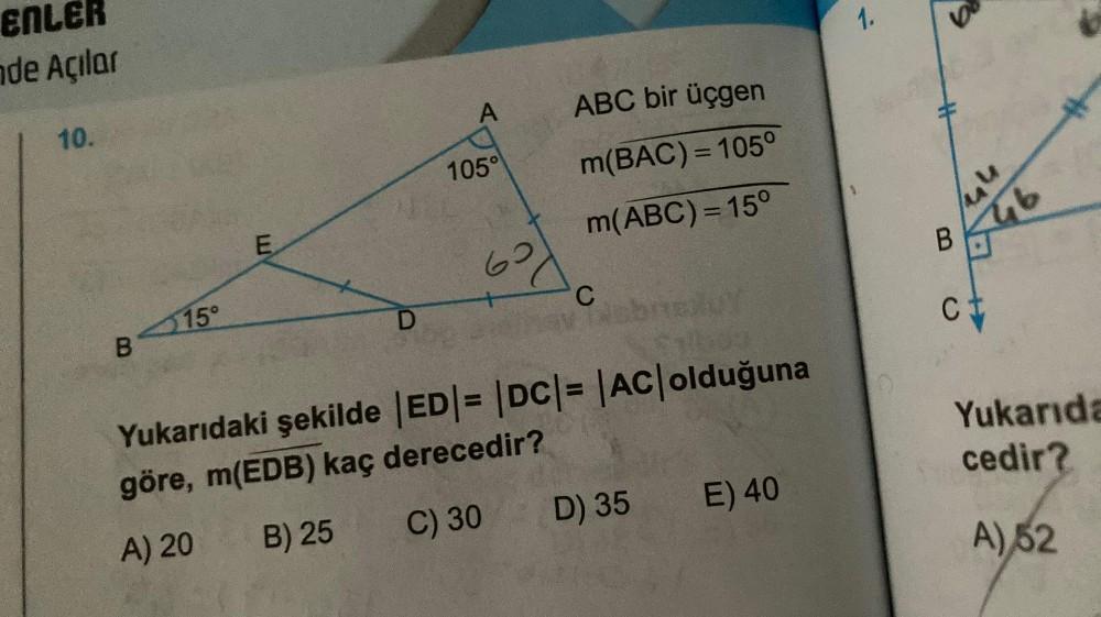 ENLER de Açılar 10. <15° B E D A 105° 63 + ABC bir üçgen m(BAC) = 105° m(ABC)=15° C Yukarıdaki şekilde |ED| = |DC| = |AC| olduğuna göre, m(EDB) kaç derecedir? A) 20 B) 25 C) 30 D) 35 E) 40 1. bo 44 B 95 Yukarıda cedir? A) 52