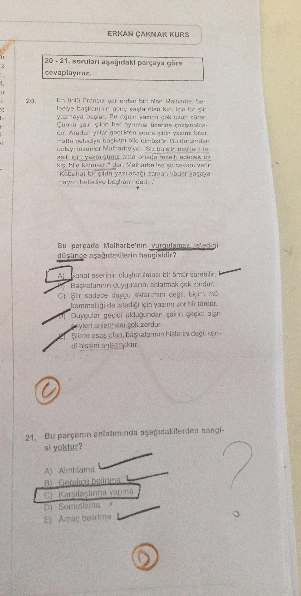 ERKAN ÇAKMAK KURS 20 - 21. soruları aşağıdaki parçaya göre cevaplayınız. En 2 r. El u 1 - 20. at - En ünlü Fransız şairlerden bi