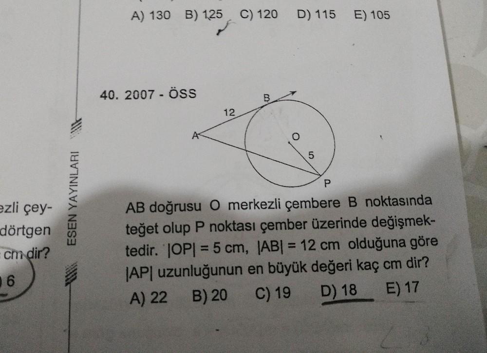 ESEN YAYINLARI A) 130 B) 125 C) 120 D) 115 E) 105 40.2007 Öss %3D 12 ezli çey- AB doğrusu 0 merkezli çembere B noktasında teğet olup P noktası çember üzerinde değişmek- tedir. JOP| = 5 cm, JAB| = 12 c