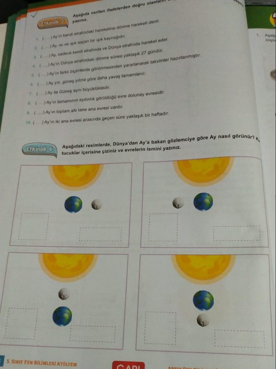 Etkinlik S )Ay'ın kendi etrafındaki hareketine dönme hareketi denir. )Ay isi ve işik saçan bir ışık kaynağıdır. 3()Ay, sadece kendi etrafında ve Dünya etrafında hareket eder. )Ay'in Dünya etrafındaki dönme süresi yaklaşık 27 gündür. 7. ( 4( Aşağıda verilen ifadelerden doğru olanlar yazınız. 5()Ay'in farklı biçimlerde görünmesinden yararlanarak takvimler hazırlanmıştır. )Ay yılı, güneş yılına göre daha yavaş tamamlanır. 8. ( ( 7. () Ay ile Güneş aynı büyüklüktedir. ..) Ay'in tamamının aydınlık görüldüğü evre dolunay evresidir. 9. () Ay'ın toplam altı tane ana evresi vardır. 10. () Ay'in iki ana evresi arasında geçen süre yaklaşık bir haftadır. Etkinlik 6 Aşağıdaki resimlerde, Dünya'dan Ay'a bakan gözlemciye göre Ay nasıl görünür? Ku tucuklar içerisine çiziniz ve evrelerin ismini yazınız. 5. SINIF FEN BİLİMLERİ ATÖLYEM CARL 1. ARTIK FRU n Asag miştir