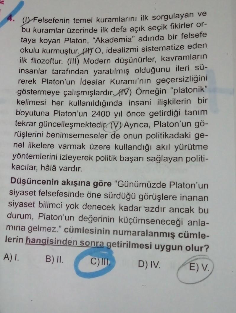 ( Felsefenin temel kuramlarını ilk sorgulayan ve bu kuramlar üzerinde ilk defa açık seçik fikirler or- taya koyan Platon, “Akademia" adında bir felsefe okulu kurmuştur. ( Ho, idealizmi sistematize eden ilk filozoftur. (III) Modern düşünürler, kavramların insanlar tarafından yaratılmış olduğunu ileri sü- rerek Platon'un İdealar Kuramı'nın geçersizliğini göstermeye çalışmışlardır. (IV) Örneğin “platonik” kelimesi her kullanıldığında insani ilişkilerin bir boyutuna Platon'un 2400 yıl önce getirdiği tanım tekrar güncelleşmektedir. (V) Ayrıca, Platon'un gö- rüşlerini benimsemeseler de onun politikadaki ge- nel ilkelere varmak üzere kullandığı akıl yürütme yöntemlerini izleyerek politik başarı sağlayan politi- kacilar, hâlâ vardır. Düşüncenin akışına göre "Günümüzde Platon'un siyaset felsefesinde öne sürdüğü görüşlere inanan siyaset bilimci yok denecek kadar azdır ancak bu durum, Platon'un değerinin küçümseneceği anla- mina gelmez." cümlesinin numaralanmış cümle- lerin hangisinden sonra getirilmesi uygun olur? A)T. B) II. C)IN. D) IV. E) V.