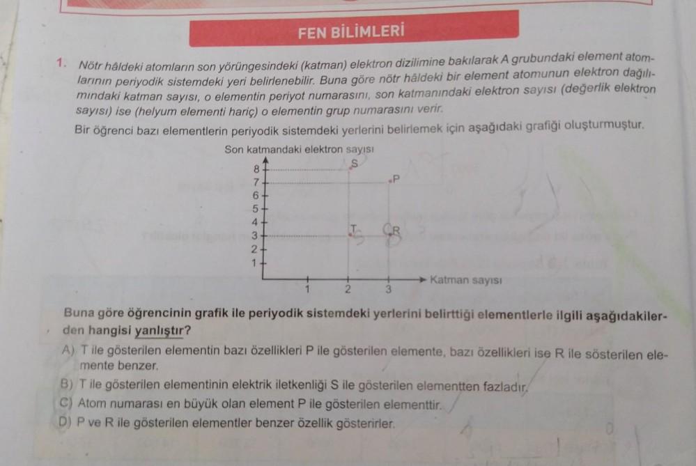 FEN BİLİMLERİ 1. Nötr hâldeki atomların son yörüngesindeki (katman) elektron dizilimine bakılarak A grubundaki element atom- larının periyodik sistemdeki yeri belirlenebilir . Buna göre nötr hâldeki bir element atomunun elektron dağılı- mindaki katman sayısı, o elementin periyot numarasını, son katmanındaki elektron sayısı (değerlik elektron sayısı) ise (helyum elementi hariç) o elementin grup numarasını verir. Bir öğrenci bazı elementlerin periyodik sistemdeki yerlerini belirlemek için aşağıdaki grafiği oluşturmuştur. Son katmandaki elektron sayısı P 8 7 6 5 4 3 2 1 Katman sayısı 1 2 3 Buna göre öğrencinin grafik ile periyodik sistemdeki yerlerini belirttiği elementlerle ilgili aşağıdakiler- den hangisi yanlıştır? A) T ile gösterilen elementin bazı özellikleri P ile gösterilen elemente, bazı özellikleri ise R ile sösterilen ele- mente benzer. B) T ile gösterilen elementinin elektrik iletkenliği S ile gösterilen elementten fazladır. C) Atom numarası en büyük olan element P ile gösterilen elementtir. D) P ve R ile gösterilen elementler benzer özellik gösterirler.