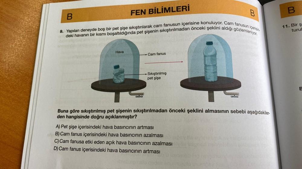 FEN BİLİMLERİ 9. Yapılan deneyde boş bir pet şişe sıkıştırılarak cam fanusun içerisine konuluyor. Cam fanusun içerisin- deki havanın bir kısmı boşaltıldığında pet şişenin sıkıştırılmadan önceki şeklini aldığı gözlemleniyor. B Hava Cam fanus Sıkıştırılmış pet şişe B DIME A) Pet şişe içerisindeki hava basıncının artması B) Cam fanus içerisindeki hava basıncının azalması C) Cam fanusa etki eden açık hava basıncının azalması D) Cam fanus içerisindeki hava basıncının artması Buna göre sıkıştırılmış pet şişenin sıkıştırılmadan önceki şeklini almasının sebebi aşağıdakiler- den hangisinde doğru açıklanmıştır? B 11. Bir ş turul B
