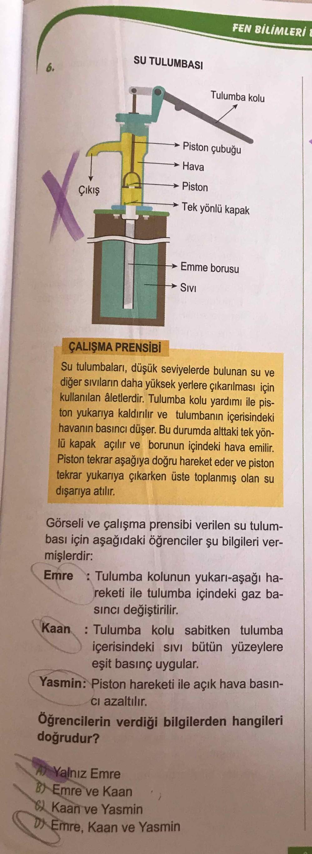 FEN BİLİMLERİ SU TULUMBASI 6. Tulumba kolu Piston çubuğu Hava Çıkış Piston Tek yönlü kapak → Emme borusu SIVI ÇALIŞMA PRENSİBİ Su tulumbaları, düşük seviyelerde bulunan su ve diğer sıvıların daha yüksek yerlere çıkarılması için kullanılan âletlerdir. Tulumba kolu yardımı ile pis- ton yukarıya kaldırılır ve tulumbanın içerisindeki havanın basıncı düşer. Bu durumda alttaki tek yön- lü kapak açılır ve borunun içindeki hava emilir. Piston tekrar aşağıya doğru hareket eder ve piston tekrar yukarıya çıkarken üste toplanmış olan su dışarıya atılır. Görseli ve çalışma prensibi verilen su tulum- bası için aşağıdaki öğrenciler şu bilgileri ver- mişlerdir: Emre : Tulumba kolunun yukarı-aşağı ha- reketi ile tulumba içindeki gaz ba- sinci değiştirilir. Kaan : Tulumba kolu sabitken tulumba içerisindeki sivi bütün yüzeylere eşit basınç uygular. Yasmin: Piston hareketi ile açık hava basın- ci azaltılır. Öğrencilerin verdiği bilgilerden hangileri doğrudur? A Yalnız Emre B) Emre ve Kaan 6) Kaan ve Yasmin DX Emre, Kaan ve Yasmin