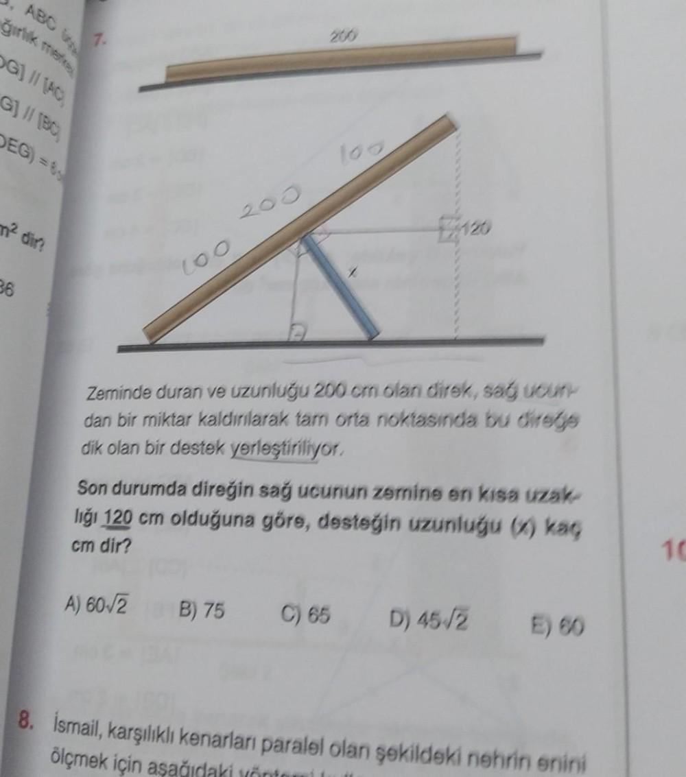 girlik merks G] // [AC G] // [BC DEG)=8 36 7. Loo loo Zeminde duran ve uzunluğu 200 cm olan direk, sağ ucun- dan bir miktar kaldırılarak tam orta noktasında bu direge dik olan bir destek yerleştiriliyor. Son durumda direğin sağ ucunun zemine en kısa uzak- liği 120 cm olduğuna göre, desteğin uzunluğu (x) kaç cm dir? A) 60-√2 B) 75 C) 65 D) 45-√2 E) 60 8. İsmail, karşılıklı kenarları paralel olan şekildeki nehrin enini ölçmek için aşağıdaki yönte 10