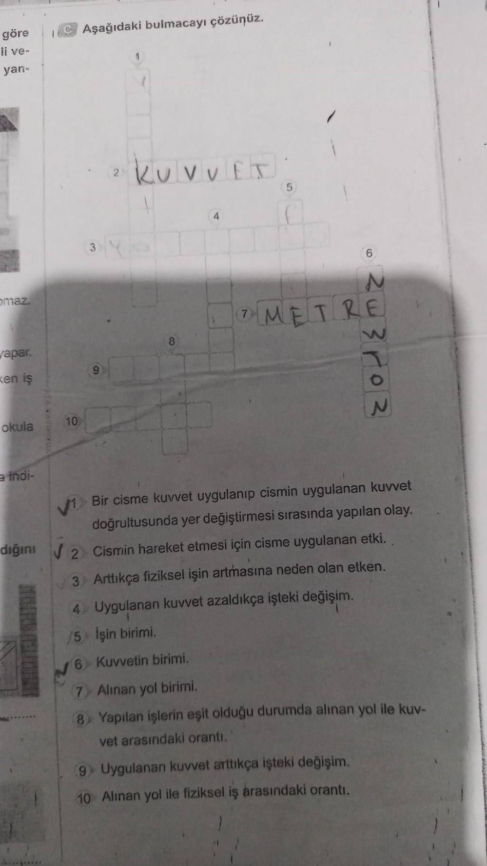 göre li ve- yan- omaz. yapar. ken iş okula a indi- 1 **** CAşağıdaki bulmacayı çözünüz. 10 3 9 2 1 KUVVET 8 4 5 6 N METRE W V1 Bir cisme kuvvet uygulanıp cismin uygulanan kuvvet doğrultusunda yer değiştirmesi sırasında yapılan olay. dığını ✔2 Cismin hareket etmesi için cisme uygulanan etki.. 3) Arttıkça fiziksel işin artmasına neden olan etken. 4 Uygulanan kuvvet azaldıkça işteki değişim. 5 İşin birimi. 6 Kuvvetin birimi. (7) Alınan yol birimi. 8 Yapılan işlerin eşit olduğu durumda alınan yol ile kuv- vet arasındaki orantı. (9) Uygulanan kuvvet arttıkça işteki değişim. 10 Alınan yol ile fiziksel iş arasındaki orantı. N