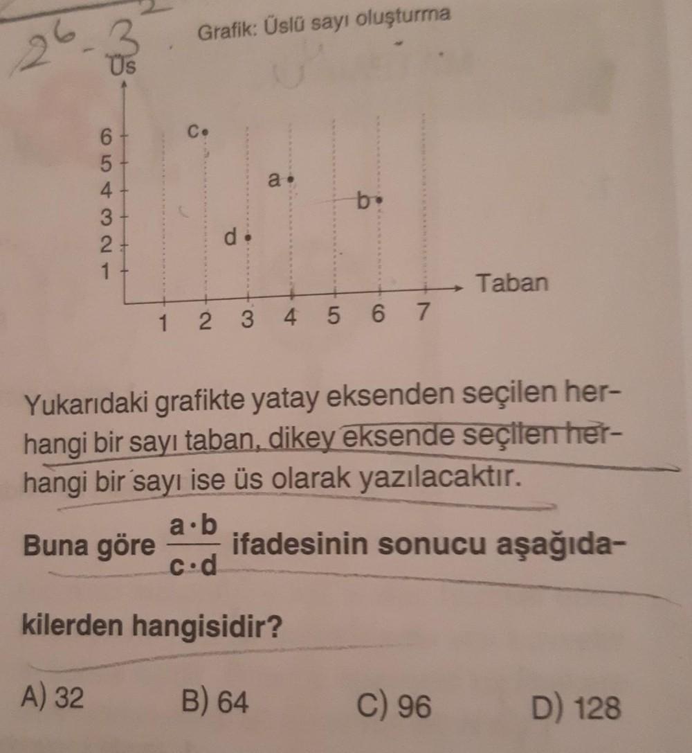 Grafik: Üslü sayı oluşturma Us a NA O OD 6 5 4 3 2 1 d Taban 1 2 3 4 5 6 7 Yukarıdaki grafikte yatay eksenden seçilen her- hangi bir sayı taban dikey eksende seçilen her- hangi bir sayı ise üs olarak yazılacaktır. a.b Buna göre ifadesinin sonucu aşağıda- c.d kilerden hangisidir? A) 32 B) 64 C) 96 D) 128