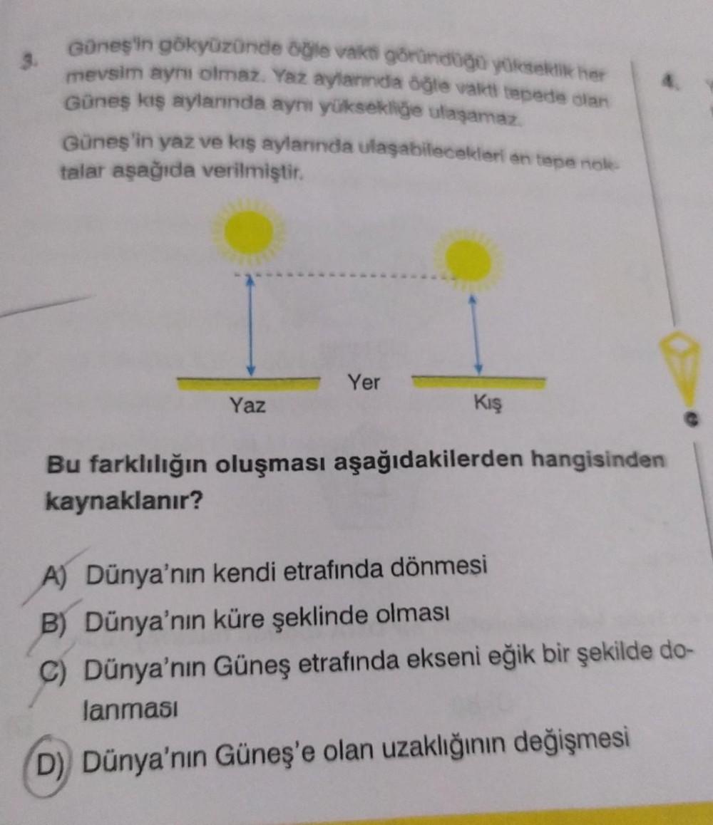 Güneş'in gökyüzünde öğle vakti göründüğü yükseklik her mevsim aynı olmaz. Yaz aylarında öğle vakti tepede olan Güneş kış aylarında aynı yüksekliğe ulaşamaz. Güneş'in yaz ve kış aylarında ulaşabilecekleri on tape nole talar aşağıda verilmiştir. Yaz Yer Kış Bu farklılığın oluşması aşağıdakilerden hangisinden kaynaklanır? A) Dünya'nın kendi etrafında dönmesi B) Dünya'nın küre şeklinde olması C) Dünya'nın Güneş etrafında ekseni eğik bir şekilde do- lanması D) Dünya'nın Güneş'e olan uzaklığının değişmesi