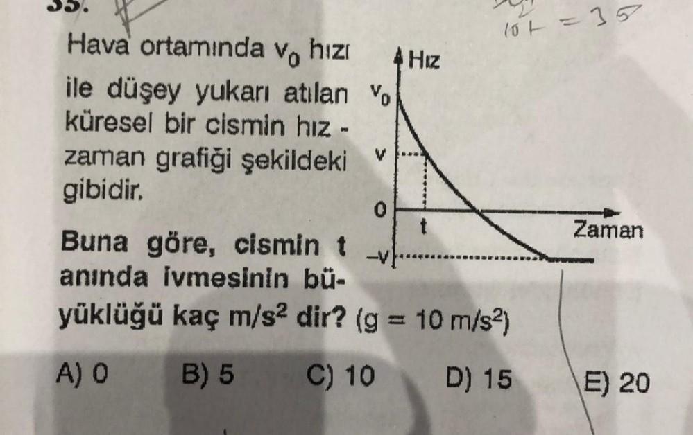 Hava ortamında vo hızı ile düşey yukarı atılan % küresel bir cismin hız - zaman grafiği şekildeki gibidir. 0 Hız 10+ = 35 Buna göre, cismin t anında ivmesinin bü- yüklüğü kaç m/s² dir? (g = 10 m/s²) A) O B) 5 C) 10 D) 15 Zaman E) 20