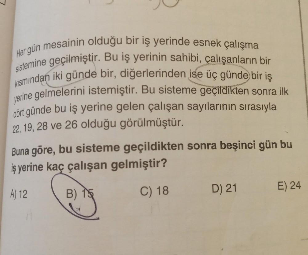 Her gün mesainin olduğu bir iş yerinde esnek çalışma sistemine geçilmiştir. Bu iş yerinin sahibi, çalışanların bir kısmından iki günde bir, diğerlerinden ise üç günde bir iş yerine gelmelerini istemiştir. Bu sisteme geçildikten sonra ilk dört günde bu iş yerine gelen çalışan sayılarının sırasıyla 22, 19, 28 ve 26 olduğu görülmüştür. c Buna göre, bu sisteme geçildikten sonra beşinci gün bu iş yerine kaç çalışan gelmiştir? A) 12 B) 15 C) 18 D) 21 E) 24