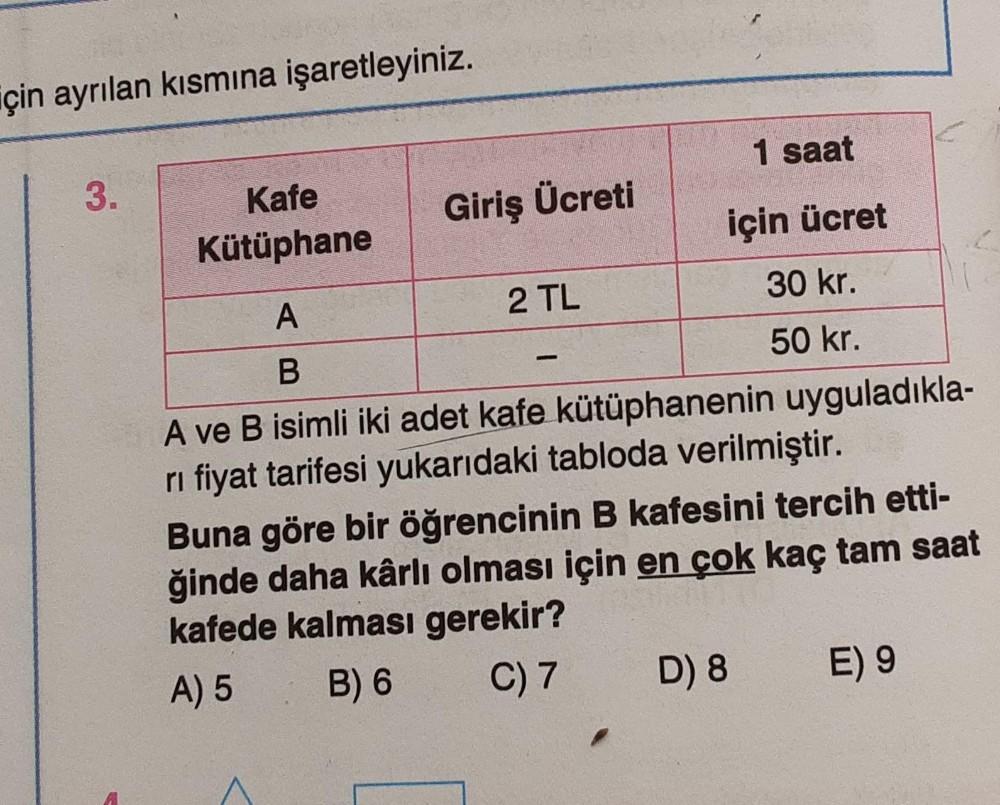 için ayrılan kısmına işaretleyiniz. 3. Kafe Kütüphane Giriş Ücreti 2 TL 1 saat için ücret 30 kr. 50 kr. A B A ve B isimli iki adet kafe kütüphanenin uyguladıkla- ri fiyat tarifesi yukarıdaki tabloda verilmiştir. 1 Buna göre bir öğrencinin B kafesini tercih etti- ğinde daha kârlı olması için en çok kaç tam saat kafede kalması gerekir? A) 5 B) 6 C) 7 D) 8 E) 9