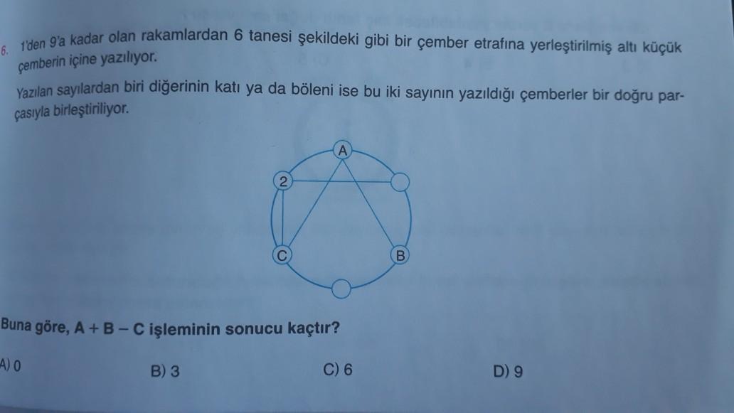i'den 9'a kadar olan rakamlardan 6 tanesi şekildeki gibi bir çember etrafına yerleştirilmiş altı küçük çemberin içine yazılıyor. Yazılan sayılardan biri diğerinin katı ya da böleni ise bu iki sayının yazıldığı çemberler bir doğru par- çasıyla birleştiriliyor. A 00 Buna göre, A+B-C işleminin sonucu kaçtır? A) O B) 3 C) 6 D) 9
