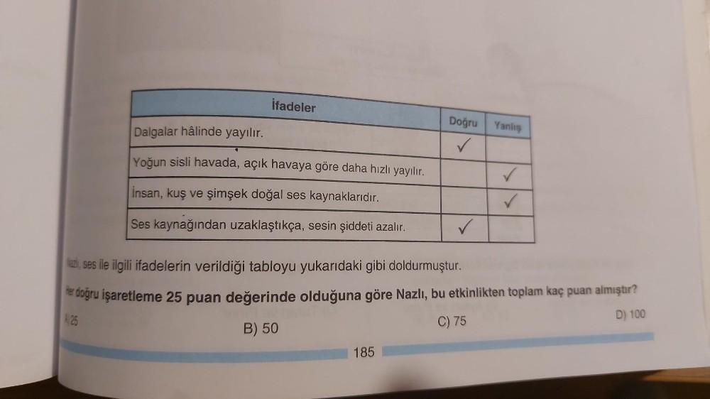 İfadeler Dalgalar hâlinde yayılır. Yoğun sisli havada, açık havaya göre daha hızlı yayılır. İnsan, kuş ve şimşek doğal ses kaynaklarıdır. Ses kaynağından uzaklaştıkça, sesin şiddeti azalır. Doğru Yanlış ✓ 185 ✓ ✓ ✓ az, ses ile ilgili ifadelerin verildiği tabloyu yukarıdaki gibi doldurmuştur. er doğru işaretleme 25 puan değerinde olduğuna göre Nazlı, bu etkinlikten toplam kaç puan almıştır? 25 D) 100 C) 75 B) 50