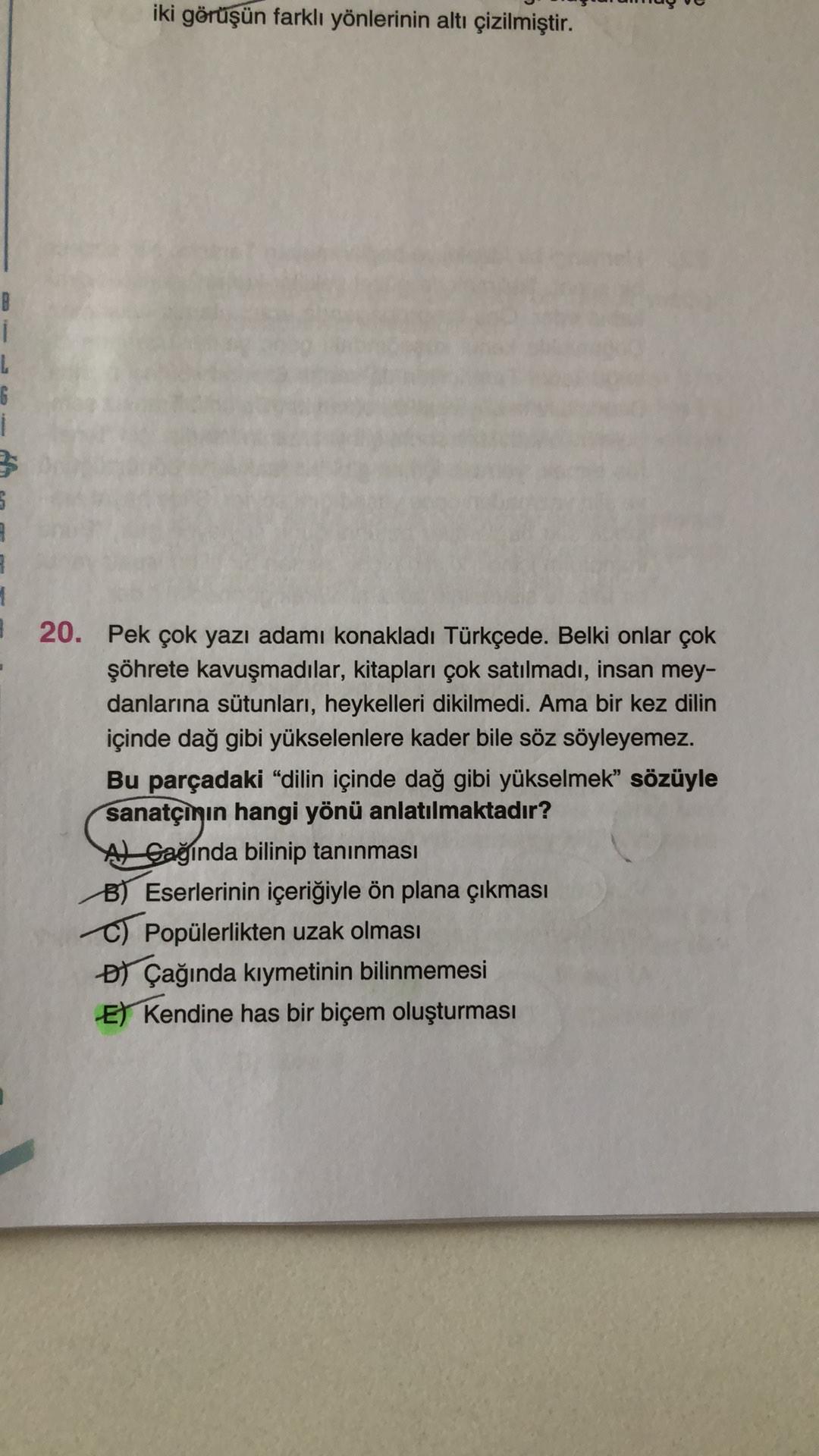 iki görüşün farklı yönlerinin altı çizilmiştir. B 1 L 6 i 3 5 # 20. Pek çok yazı adamı konakladı Türkçede. Belki onlar çok şöhrete kavuşmadılar, kitapları çok satılmadı, insan mey- danlarına sütunları, heykelleri dikilmedi. Ama bir kez dilin içinde dağ gibi yükselenlere kader bile söz söyleyemez. Bu parçadaki "dilin içinde dağ gibi yükselmek” sözüyle sanatçının hangi yönü anlatılmaktadır? Al Gağında bilinip tanınması B) Eserlerinin içeriğiyle ön plana çıkması C) Popülerlikten uzak olması o Çağında kıymetinin bilinmemesi E) Kendine has bir biçem oluşturması