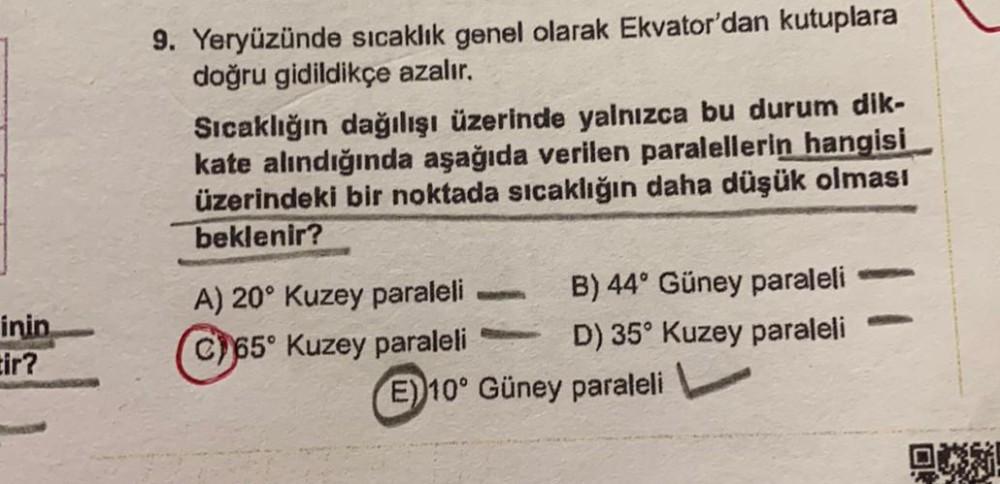 inin Eir? 9. Yeryüzünde sıcaklık genel olarak Ekvator'dan kutuplara doğru gidildikçe azalır. Sıcaklığın dağılışı üzerinde yalnızca bu durum dik- kate alındığında aşağıda verilen paralellerin hangisi üzerindeki bir noktada sıcaklığın daha düşük olması beklenir? B) 44° Güney paraleli A) 20° Kuzey paraleli paraleli Cy C65° Kuzey D) 35° Kuzey paraleli E) 10° Güney paraleli O