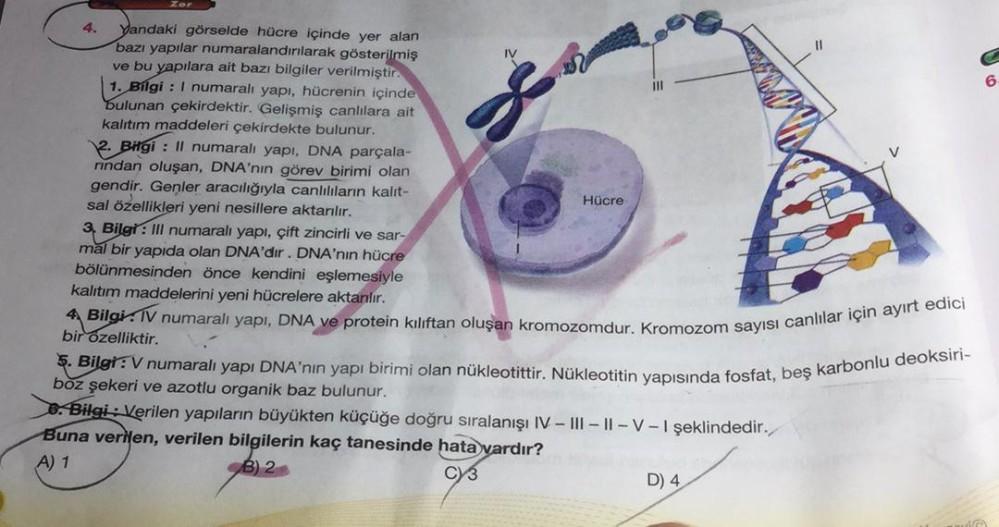 IV 6 III 4. Bilgi IV numaralı yapı, DNA ve protein kiliftan oluşan kromozomdur. Kromozom sayisi canlılar için ayırt edici 5. Bilgi: V numaralı yapı DNA'nin yapı birimi olan nükleotittir. Nükleotitin yapısında fosfat, beş karbonlu deoksiri- 4. Yandaki görselde hücre içinde yer alan bazı yapılar numaralandırılarak gösterilmiş ve bu yapılara ait bazı bilgiler verilmiştir. 1. Bilgi : I numaralı yapı, hücrenin içinde bulunan çekirdektir. Gelişmiş canlılara ait kalıtım maddeleri çekirdekte bulunur. 2. Bitgi : Il numaralı yapı, DNA parçala- rindan oluşan, DNA'nın görev birimi olan gendir. Genler aracılığıyla canlıların kalit- sal özellikleri yeni nesillere aktarılır. 3. Bilgt: Ill numaralı yapı, çift zincirli ve sar- mal bir yapıda olan DNA'dir. DNA'nın hücre bölünmesinden önce kendini eşlemesiyle kalıtım maddelerini yeni hücrelere aktarılır. bir özelliktir. Hücre boz şekeri ve azotlu organik baz bulunur. 6. Bilgi: Verilen yapıların büyükten küçüğe doğru sıralanışı IV – III - || - V- 1 şeklindedir./ Buna verilen, verilen bilgilerin kaç tanesinde hata vardır? A 1 B) 2 CY3 D) 4