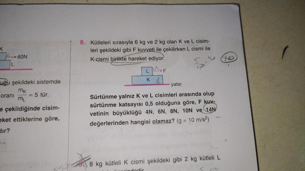 K L 60N oranı uğu şekildeki sistemde mk ML e çekildiğinde cisim- eket ettiklerine göre, dir? 200 18. Kütleleri sırasıyla 6 kg ve
