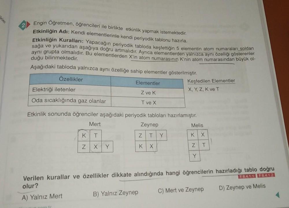 kier Engin Öğretmen, öğrencileri ile birlikte etkinlik yapmak istemektedir. Etkinliğin Adı: Kendi elementlerinle kendi periyodik tablonu hazırla. Etkinliğin Kuralları: Yapacağın periyodik tabloda keşfettiğin 5 elementin atom numaraları soldan sağa ve yukarıdan aşağıya doğru artmalıdır. Ayrıca elementlerden yalnızca aynı özelliği gösterenler aynı grupta olmalıdır. Bu elementlerden X'in atom numarasının K'nin atom numarasından büyük ol- duğu bilinmektedir. Aşağıdaki tabloda yalnızca aynı özelliğe sahip elementler gösterilmiştir. Özellikler Elektriği iletenler Oda sıcaklığında gaz olanlar Etkinlik sonunda öğrenciler aşağıdaki periyodik tabloları hazırlamıştır. Zeynep T Mert K T N Elementler Z ve K T ve X XY N B) Yalnız Zeynep KX Keşfedilen Elementler X, Y, Z, K ve T Y Melis KX Z T Y Verilen kurallar ve özellikler dikkate alındığında hangi öğrencilerin hazırladığı tablo doğru olur? F8.4.1.1 F8.4.1.2 A) Yalnız Mert C) Mert ve Zeynep D) Zeynep ve Melis