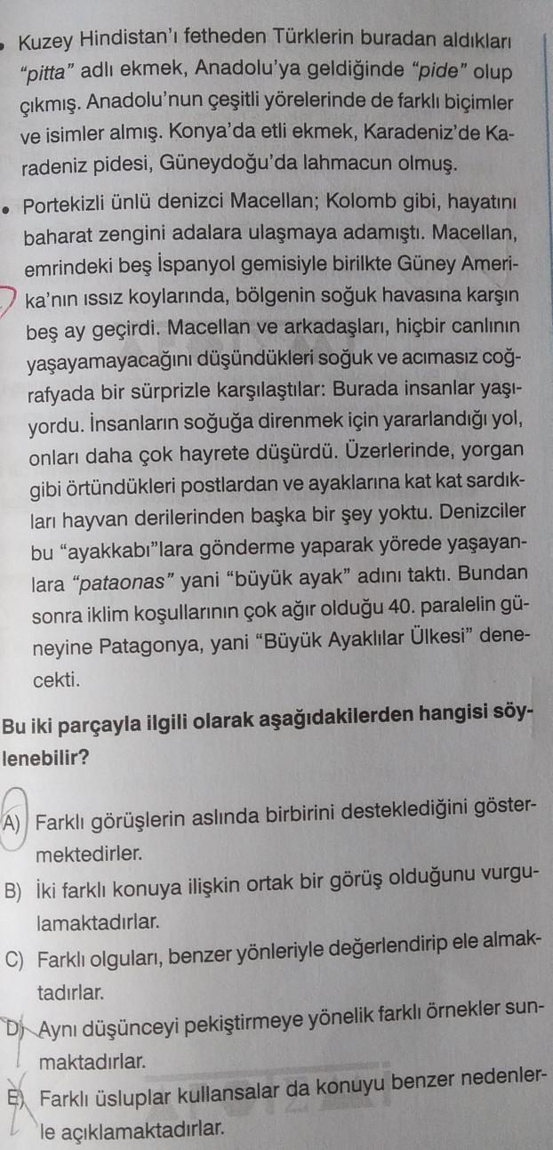 Kuzey Hindistan'ı fetheden Türklerin buradan aldıkları "pitta" adlı ekmek, Anadolu'ya geldiğinde “pide" olup çıkmış. Anadolu'nun çeşitli yörelerinde de farklı biçimler ve isimler almış. Konya'da etli ekmek, Karadeniz'de Ka- radeniz pidesi, Güneydoğu'da lahmacun olmuş. • Portekizli ünlü denizci Macellan; Kolomb gibi, hayatını baharat zengini adalara ulaşmaya adamıştı. Macellan, emrindeki beş İspanyol gemisiyle birilkte Güney Ameri- ka'nın issiz koylarında, bölgenin soğuk havasına karşın beş ay geçirdi. Macellan ve arkadaşları, hiçbir canlının yaşayamayacağını düşündükleri soğuk ve acımasız coğ- rafyada bir sürprizle karşılaştılar: Burada insanlar yaşı- yordu. İnsanların soğuğa direnmek için yararlandığı yol, onları daha çok hayrete düşürdü. Üzerlerinde, yorgan gibi örtündükleri postlardan ve ayaklarına kat kat sardik- ları hayvan derilerinden başka bir şey yoktu. Denizciler bu "ayakkabı”lara gönderme yaparak yörede yaşayan- lara “pataonas" yani "büyük ayak" adını taktı. Bundan sonra iklim koşullarının çok ağır olduğu 40. paralelin gü- neyine Patagonya, yani “Büyük Ayaklılar Ülkesi” dene- cekti. Bu iki parçayla ilgili olarak aşağıdakilerden hangisi söy- lenebilir? A) Farklı görüşlerin aslında birbirini desteklediğini göster- mektedirler. B) İki farklı konuya ilişkin ortak bir görüş olduğunu vurgu- lamaktadırlar. C) Farklı olguları, benzer yönleriyle değerlendirip ele almak- tadırlar. Di Aynı düşünceyi pekiştirmeye yönelik farklı örnekler sun- maktadırlar. Farklı üsluplar kullansalar da konuyu benzer nedenler- le açıklamaktadırlar.