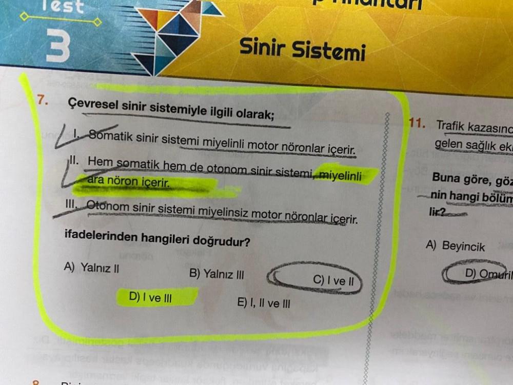 lest 3 7. Sinir Sistemi Çevresel sinir sistemiyle ilgili olarak; Somatik sinir sistemi miyelinli motor nöronlar içerir. ll. Hem somatik hem de otonom sinir sistemi, miyelinli ara nöron içerir. III. Otonom sinir sistemi miyelinsiz motor nöronlar içerir. PRAVN ifadelerinden hangileri doğrudur? A) Yalnız II D) I ve III B) Yalnız III E) I, II ve III C) I ve II ri 11. Trafik kazasınc gelen sağlık ek HEA - Buna göre, göz nin hangi bölüm SAMORGEN lir? Vertra A) Beyincik D) Omuril Tor entaarie o