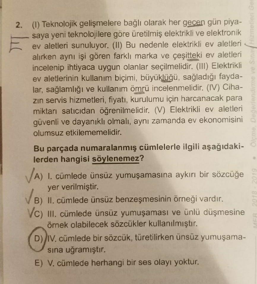 Lic 2. (1) Teknolojik gelişmelere bağlı olarak her gecen gün piya- saya yeni teknolojilere göre üretilmiş elektrikli ve elektronik ev aletleri sunuluyor. (II) Bu nedenle elektrikli ev aletleri alırken aynı işi gören farklı marka ve çeşitteki ev aletleri incelenip ihtiyaca uygun olanlar seçilmelidir. (III) Elektrikli ev aletlerinin kullanım biçimi, büyüklüğü, sağladığı fayda- lar, sağlamlığı ve kullanım ömrü incelenmelidir. (IV) Ciha- zin servis hizmetleri, fiyatı, kurulumu için harcanacak para miktarı satıcıdan öğrenilmelidir. (V) Elektrikli ev aletleri güvenli ve dayanıklı olmalı, aynı zamanda ev ekonomisini olumsuz etkilememelidir. Bu parçada numaralanmış cümlelerle ilgili aşağıdaki- lerden hangisi söylenemez? VA) 1. cümlede ünsüz yumuşamasına aykırı bir sözcüğe yer verilmiştir. VB) . B) II. cümlede ünsüz benzeşmesinin örneği vardır. Vc) III. cümlede ünsüz yumuşaması ve ünlü düşmesine örnek olabilecek sözcükler kullanılmıştır. D) IV. cümlede bir sözcük, türetilirken ünsüz yumuşama- sina uğramıştır. E) V. cümlede herhangi bir ses olayı yoktur. Olcme. Degerlendirme ve Sine Her VE MER 2018 2019