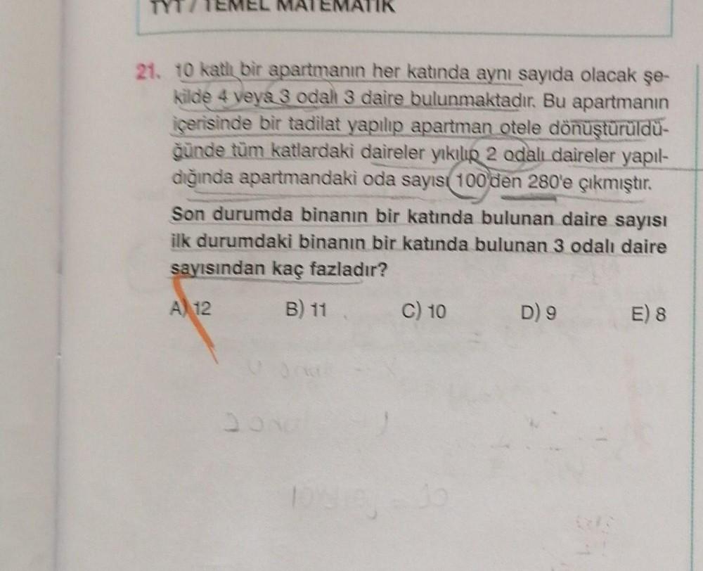 MA 21. 10 katli bir apartmanın her katında aynı sayıda olacak şe- kilde 4 veya 3 odal 3 daire bulunmaktadır. Bu apartmanın içerisinde bir tadilat yapılıp apartman otele dönuştürüldü- Qünde tüm katlardaki daireler yıkılıp 2 odalı daireler yapıl- diğinda apartmandaki oda sayısı 100 den 280'e çıkmıştır. Son durumda binanın bir katında bulunan daire sayısı ilk durumdaki binanın bir katında bulunan 3 odalı daire sayısından kaç fazladır? A) 12 B) 11 C) 10 D) 9 E) 8