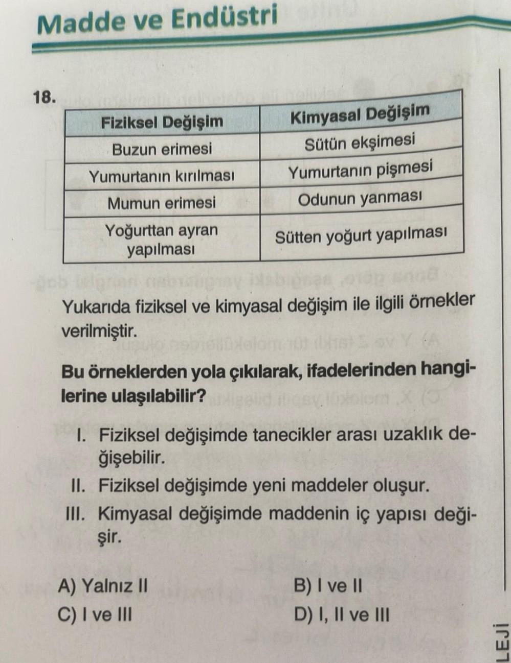 Madde ve Endüstri 18. Fiziksel Değişim Buzun erimesi Yumurtanın kırılması Mumun erimesi Yoğurttan ayran yapılması Kimyasal Değişim Sütün ekşimesi Yumurtanın pişmesi Odunun yanması Sütten yoğurt yapılması Yukarıda fiziksel ve kimyasal değişim ile ilgili örnekler verilmiştir. Bu örneklerden yola çıkılarak, ifadelerinden hangi- lerine ulaşılabilir? I. Fiziksel değişimde tanecikler arası uzaklık de- ğişebilir. II. Fiziksel değişimde yeni maddeler oluşur. III. Kimyasal değişimde maddenin iç yapısı deği- şir. A) Yalnız II C) I ve III B) I ve II D) I, II ve III LEJİ