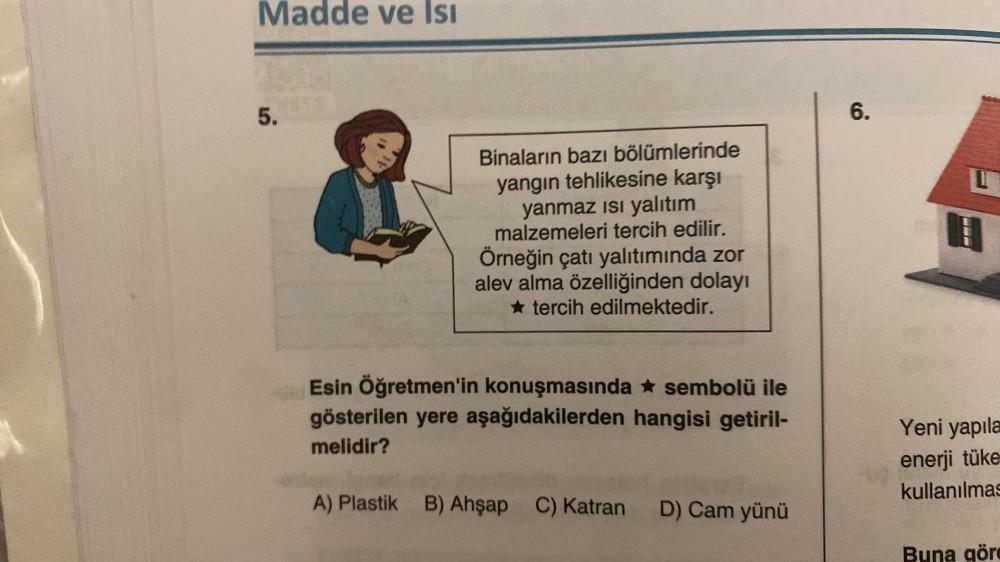 Madde ve Isı din 5. Binaların bazı bölümlerinde yangın tehlikesine karşı yanmaz ısı yalıtım malzemeleri tercih edilir. Örneğin çatı yalıtımında zor alev alma özelliğinden dolayı tercih edilmektedir. Esin Öğretmen'in konuşmasında ✩ sembolü ile gösterilen yere aşağıdakilerden hangisi getiril- melidir? A) Plastik B) Ahşap C) Katran D) Cam yünü 6. 1 Yeni yapıla enerji tüke kullanılmas Buna göre