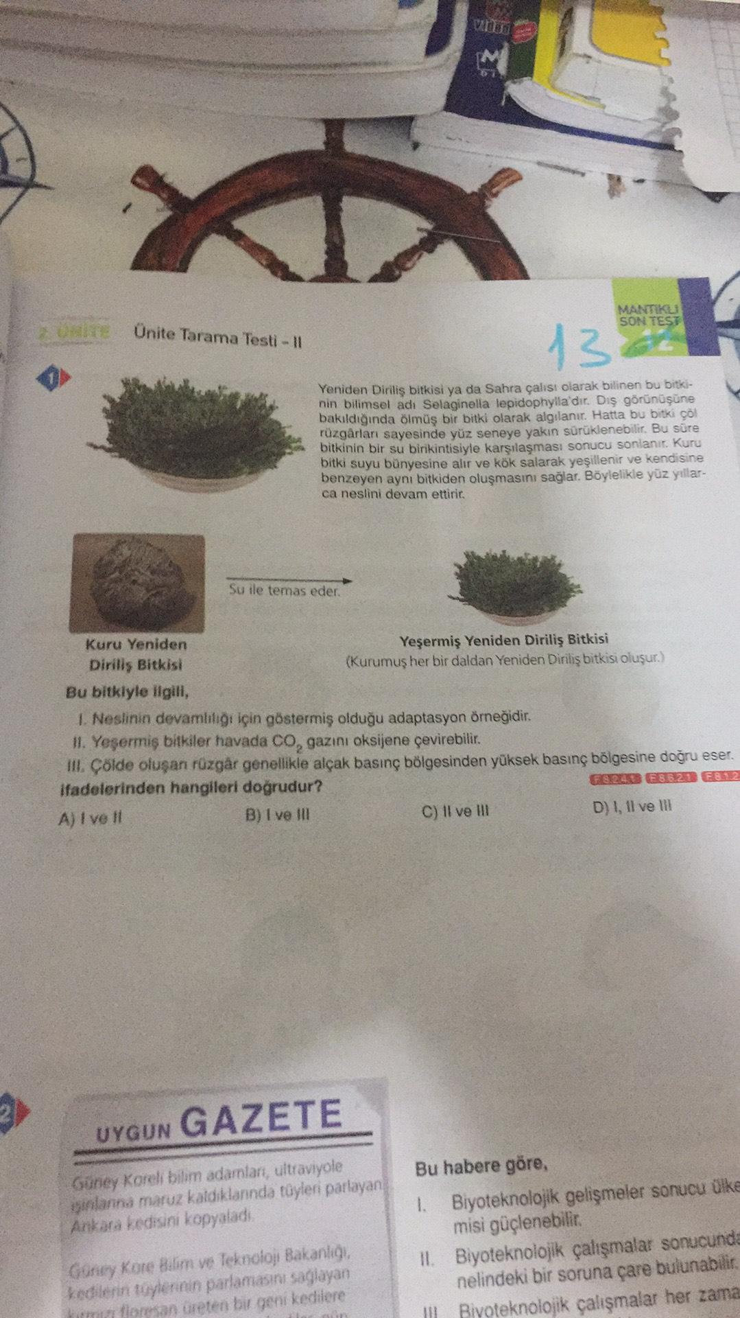 MANTIKLI SON TEST te Onite Tarama Testi - 11 13 Yeniden Diriliş bitkisi ya da Sahra çalisi olarak bilinen bu bitkis- nin bilimsel adi Selaginella lepidophylla'dır. Dış görünüşüne bakıldığında ölmüş bir bitki olarak algılanır. Hatta bu bitki çol rüzgârlar sayesinde yüz seneye yakın sürüklenebilir. Bu süre bitkinin bir su birikintisiyle karşılaşması sonucu sonlanır. Kuru bitki suyu bünyesine alir ve kök salarak yeşillenir ve kendisine benzeyen aynı bitkiden oluşmasını sağlar. Böylelikle yüz yıllar- ca neslini devam ettirir. Su ile temas eder. Kuru Yeniden Yeşermiş Yeniden Diriliş Bitkisi Dirills Bitkisi (Kurumuş her bir daldan Yeniden Diriliş bitkisi oluşur.) Bu bitkiyle ilgili 1. Neslinin devamliligi için göstermiş olduğu adaptasyon örneğidir. 11. Yeşermiş bitkiler havada co, gazını oksijene çevirebilir. III. Çölde oluşan rüzgâr genellikle alçak basınç bölgesinden yüksek basınç bölgesine doğru eser. ifadelerinden hangileri doğrudur? 58.240 68.521 6832 A) I ve 11 B) I ve II C) II ve III D) I, II ve III UYGUN GAZETE Güney Koreli bilim adamlart, ultraviyole Einlanna maruz kaldiklannda tüyleri parlayan Ankara kedisini kopyaladi. Bu habere göre, 1. Biyoteknolojik gelişmeler sonucu ülke misi güçlenebilir II Biyoteknolojik çalışmalar sonucunda nelindeki bir soruna çare bulunabilir Bivoteknolojik çalışmalar her zama Gurury Kore Bilim ve Teknoloji Bakanligi, kedilerin tüylerinin parlamasını saglayan i florsan üreten bir geni kedilere 111