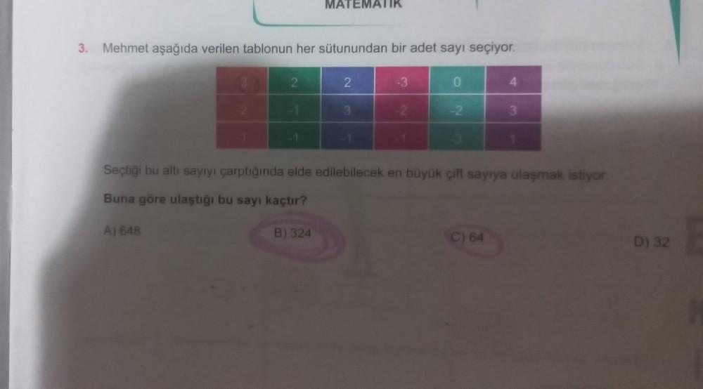 MAT KATIK 3. Mehmet aşağıda verilen tablonun her sütunundan bir adet sayı seçiyor. 2 -3 0 N 3 -2 -2 3 Seçtiği bu alti sayıyı çarptığında elde edilebilecek en büyük çift sayıya ulaşmak istiyor. Buna göre ulaştığı bu sayı kaçtır? A) 648 B) 324 C) 64 D) 32