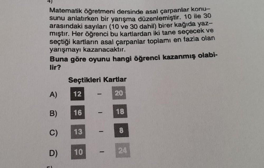 Matematik öğretmeni dersinde asal çarpanlar konu- sunu anlatırken bir yarışma düzenlemiştir. 10 ile 30 arasındaki sayıları (10 ve 30 dahil) birer kağıda yaz- mıştır. Her öğrenci bu kartlardan iki tane seçecek ve seçtiği kartların asal çarpanlar toplamı en fazla olan yarışmayı kazanacaktır. Buna göre oyunu hangi öğrenci kazanmış olabi- lir? A) B) C) D) Seçtikleri Kartlar 12 20 16 13 10 - I - 18 - 1 8 24