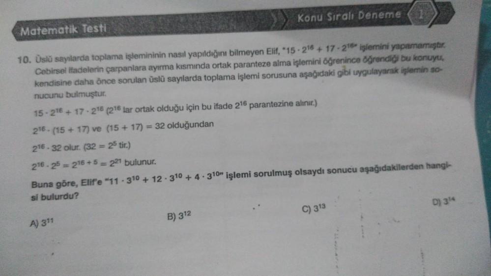 Matematik Testi 10. Üslü sayılarda toplama işlemininin nasıl yapıldığını bilmeyen Elif, "15-216+ 17-216 işlemini yapamamıştır. Cebirsel ifadelerin çarpanlara ayırma kısmında ortak paranteze alma işlemini öğrenince öğrendiği bu konuyu, kendisine daha önce sorulan üslü sayılarda toplama işlemi sorusuna aşağıdaki gibi uygulayarak işlemin so- nucunu bulmuştur. 15-216 +17-216 (216 lar ortak olduğu için bu ifade 216 parantezine alınır.) 216 (15+17) ve (15+17) = 32 olduğundan 216-32 olur. (32 = 25 tir.) 216-25= 216 + 5 = 221 bulunur. Konu Sıralı Deneme Buna göre, Elif'e "11-310 + 12-310 + 4-310 işlemi sorulmuş olsaydı sonucu aşağıdakilerden hangi- si bulurdu? A) 311 B) 312 C) 313 D) 3¹4