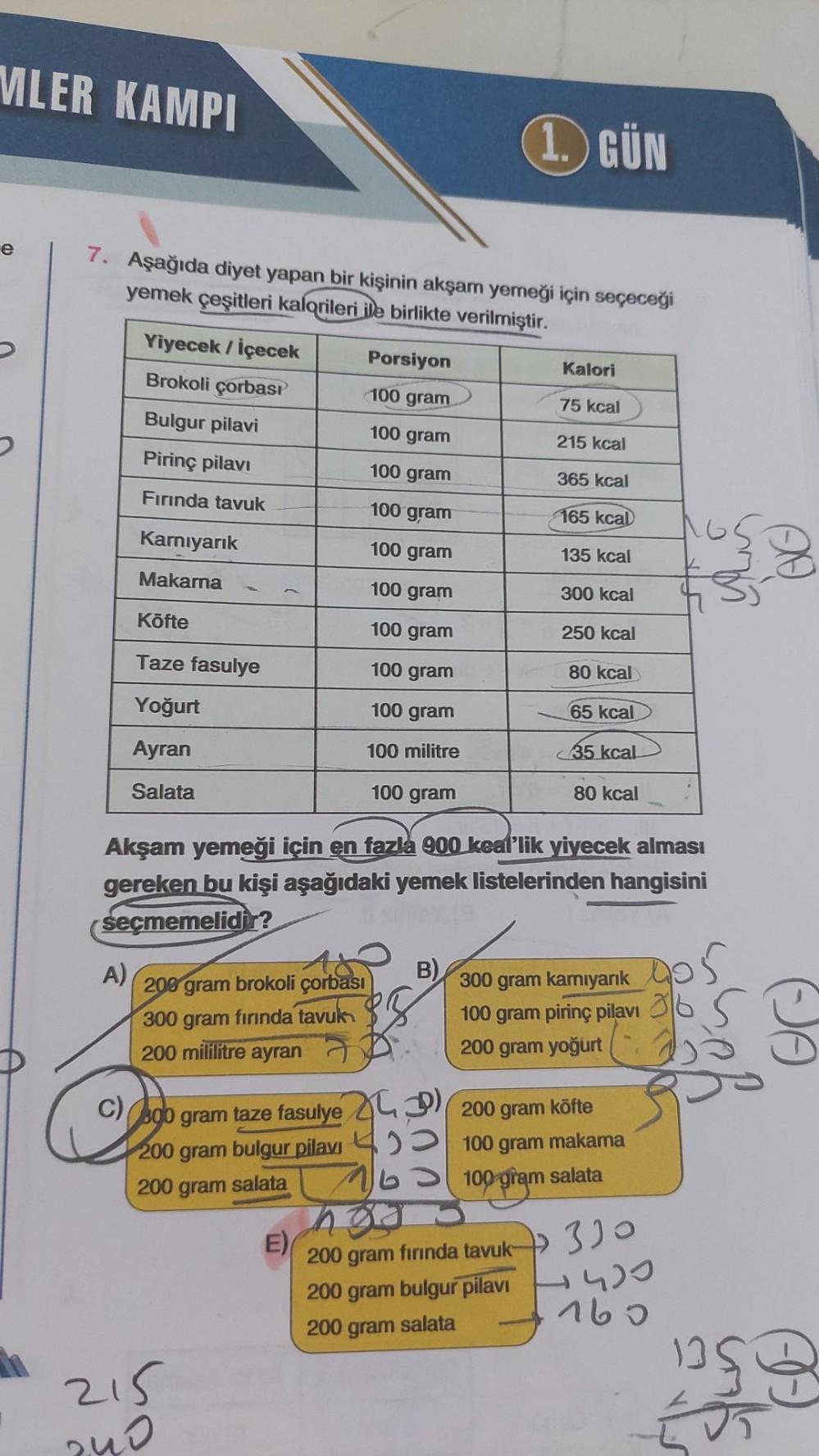 MLER KAMPI e 7. Aşağıda diyet yapan bir kişinin akşam yemeği için seçeceği yemek çeşitleri kalorileri ile birlikte verilmiştir.