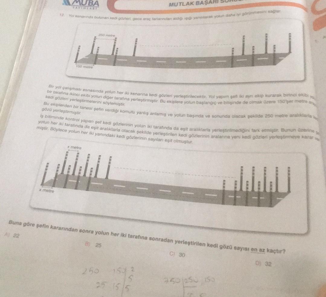 MUBA MUTLAK BAŞARIS VAENLAR 12 Yonanda bulunan od goton gece ara farbandonado yanayo 250 metre 150 metre Bir yol çalışması esnasında yolun her iki kenanna kedi gözleri yerleştirilecektir. Yol yapım selayekip kurarak benne kedi gözleri yerleştirmelerini söylemiştir. bir tarafina ikinci ekibi yolun diger tarafına yerleştirmiştir. Bu ekiplere yolun başlangıç ve bitişinde de olmak zere 150 ser med Bu ekiplerden bir tanesi Şetin verdiği komutu yanlış anlamış ve yolun basinda ve sonunda olacak şekilde 250 metre arra gözü yerleştirmiştir. iş bitiminde kontrol yapan şef kedi gözlerinin yolun iki tarafında da eşit aralarla yerleştirilmediğini fark etmiştir. Bunun yolun her iki tarafında da eşit aralıklarla olacak şekilde yerleştirilen kedi gözlerinin aralarına yeni kedi gozlol yerleştirmeye karar miştir. Böylece yolun her iki yanındaki kedi gözlerinin sayılan eşit olmuştur. x metre x metre Buna göre şefin kararından sonra yolun her iki tarafına sonradan yerleştirilen kedi gözü sayısı en az kaçtır? 22 B) 25 C30 D) 32 250 25 515 2505