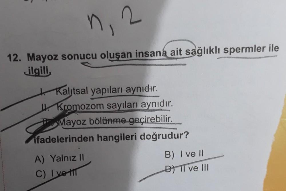 n₁ 2 12. Mayoz sonucu oluşan insana ait sağlıklı spermler ile ilgili, Kalıtsal yapıları aynıdır. J. Kromozom sayıları aynıdır. Mayoz bölünme geçirebilir. ifadelerinden hangileri doğrudur? A) Yalnız II B) I ve II C) Ive HT B) II ve III