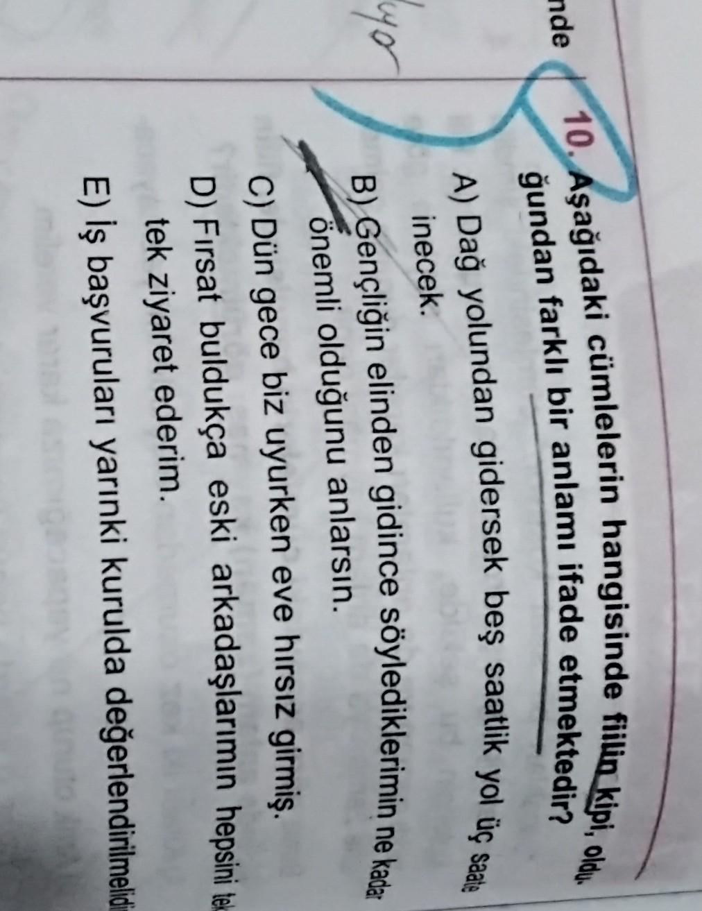 nde 10. Aşağıdaki cümlelerin hangisinde fiilin kipi, oldu. ğundan farklı bir anlamı ifade etmektedir? A) Dağ yolundan gidersek beş saatlik yol üç saate inecek. lyer B) Gençliğin elinden gidince söylediklerimin ne kadar önemli olduğunu anlarsın. C) Dün gece biz uyurken eve hırsız girmiş. D) Fırsat buldukça eski arkadaşlarımın hepsini tek tek ziyaret ederim. E) İş başvuruları yarınki kurulda değerlendirilmelidi-