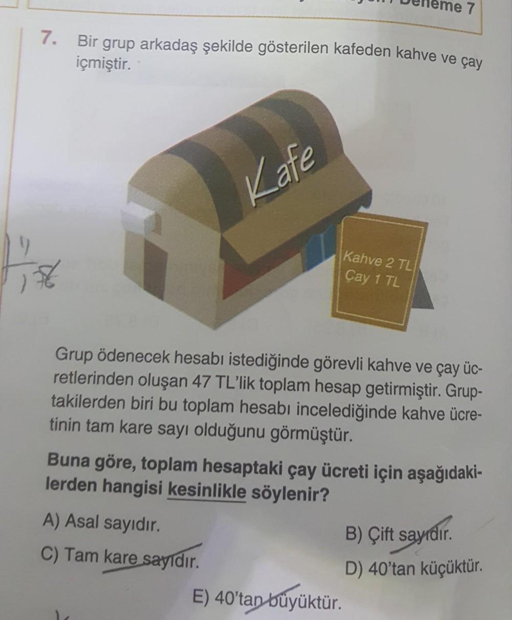 ne 7 7. Bir grup arkadaş şekilde gösterilen kafeden kahve ve çay içmiştir. Kafe 18 Kahve 2 TL Çay 1 TL Grup ödenecek hesabı istediğinde görevli kahve ve çay üc- retlerinden oluşan 47 TL'lik toplam hesap getirmiştir. Grup- takilerden biri bu toplam hesabı incelediğinde kahve ücre- tinin tam kare sayı olduğunu görmüştür. Buna göre, toplam hesaptaki çay ücreti için aşağıdaki- lerden hangisi kesinlikle söylenir? A) Asal sayıdır. C) Tam kare sayıdır. E) 40'tan büyüktür. B) Çift sayıdır . D) 40'tan küçüktür.