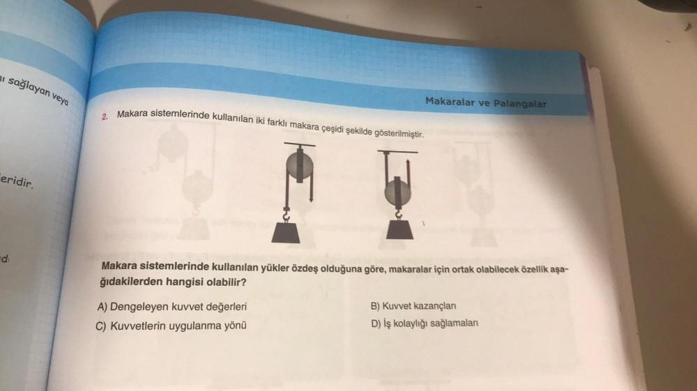 ni sağlayan veya eridir. di 2. Makara sistemlerinde kullanılan iki farklı makara çeşidi şekilde gösterilmiştir. Makaralar ve Palangalar Makara sistemlerinde kullanılan yükler özdeş olduğuna göre, makaralar için ortak olabilecek özellik aşa- ğıdakilerden hangisi olabilir? A) Dengeleyen kuvvet değerleri C) Kuvvetlerin uygulanma yönü B) Kuvvet kazançları D) İş kolaylığı sağlamalanı
